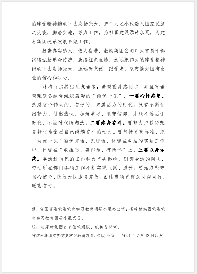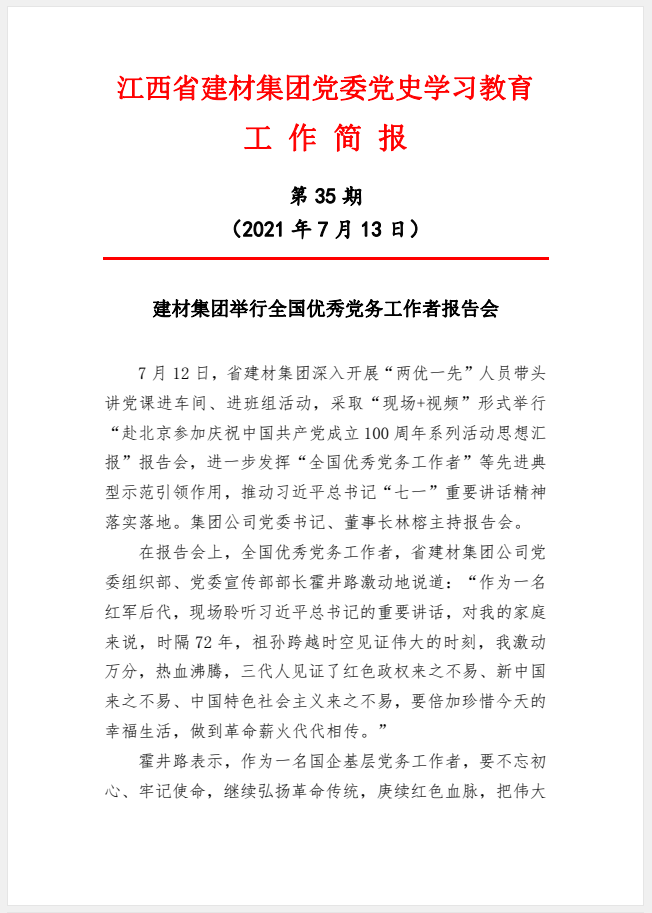 【概要描述】江西省建材集團(tuán)黨委黨史學(xué)習(xí)教育工作簡(jiǎn)報(bào)第35期:建材集團(tuán)舉行全國優(yōu)秀黨務(wù)工作者報(bào)告會(huì)